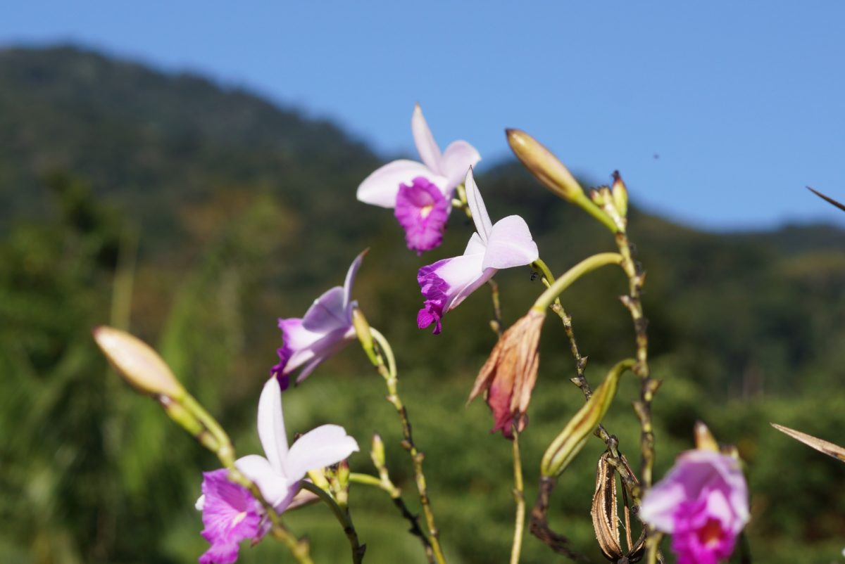 São Helicônias, Alpínias, Bromélias e Orquídeas de todos os tipos e cores.