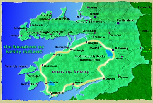 O Ring of Kerry ou “Anel de Kerry” é um passeio panorâmico ao redor da Península Iveragh, no sudoeste da Irlanda no Condado de Kerry. Sua rota circular com 179 km de extensão tem paisagens verdejantes, lagos e vilas costeiras rurais.