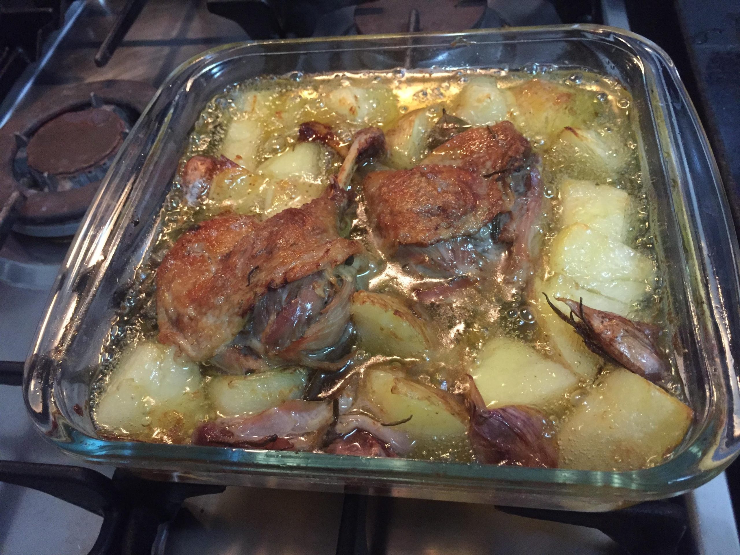 7. Ao consumir, colocar em uma assadeira as batatas cozidas e as sobrecoxas com a pele para cima para dourar. Levar ao forno alto por 15 a 20 minutos para torrar a pele.