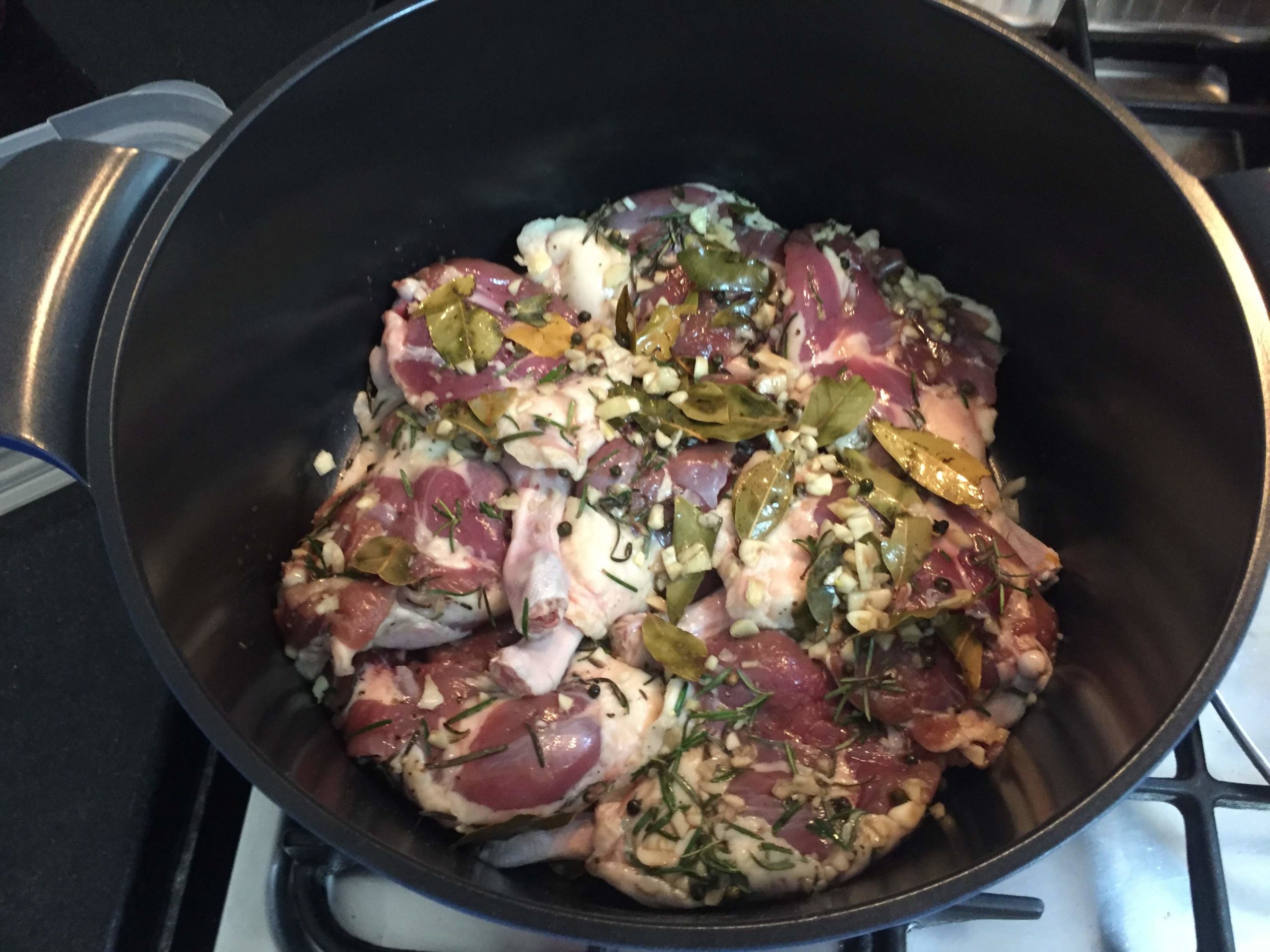 1. Temperar as coxas e sobrecoxas 1 dia antes com: alecrim, pimenta do reino em grão, louro, sal, tomilho, alho picado e azeite. Levar à geladeira por 1 dia ou 2.
