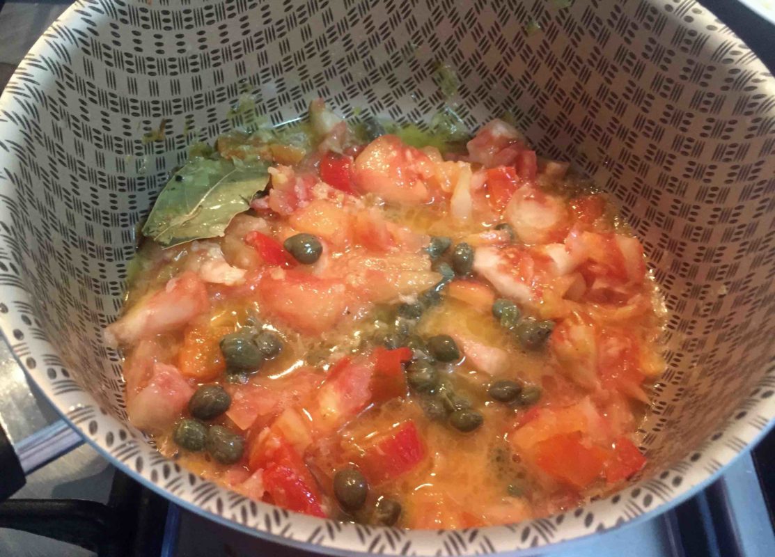 Na mesma panela juntar os tomates, o pimentão, a folha de louro, a alcaparra, o sal e a pimenta do reino e cozinhar por 5 minutos.