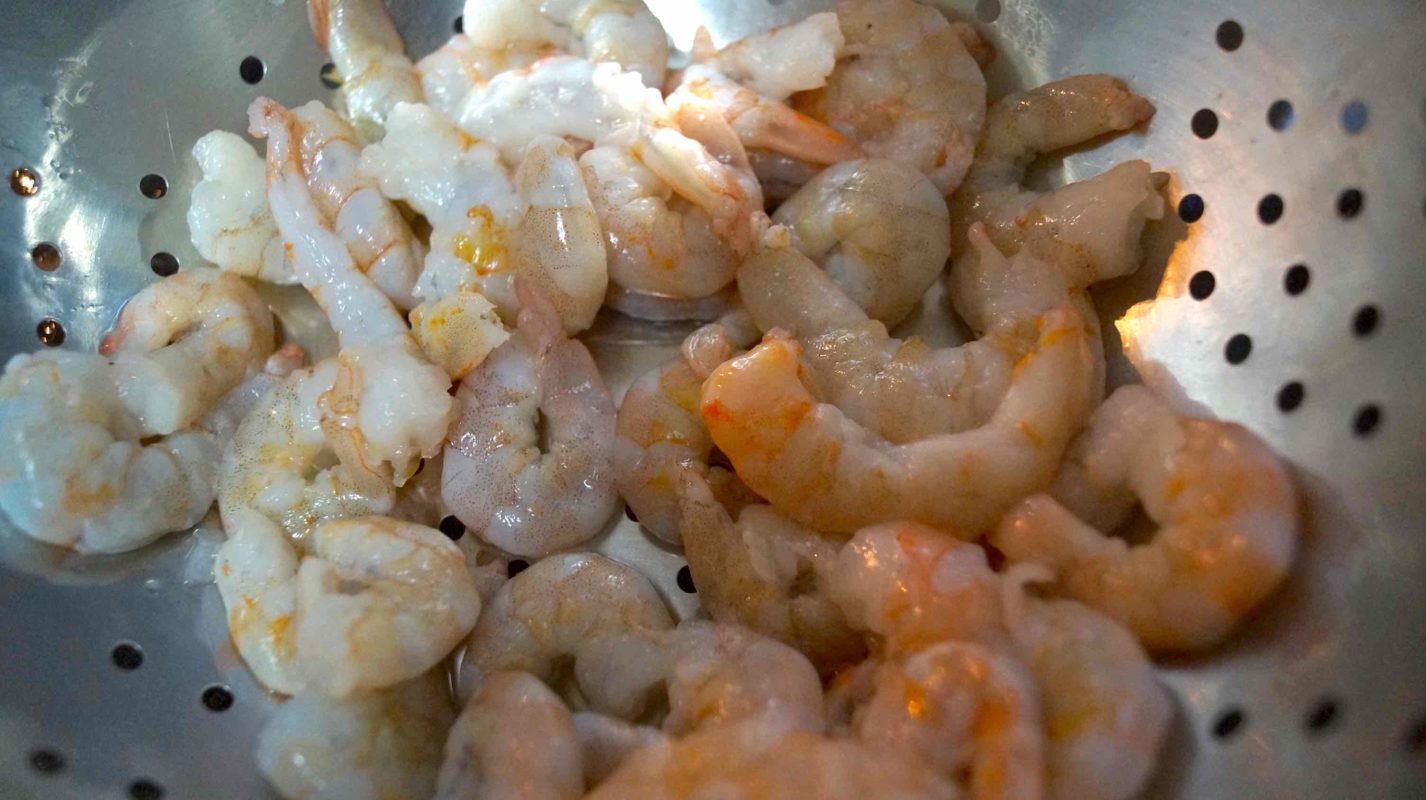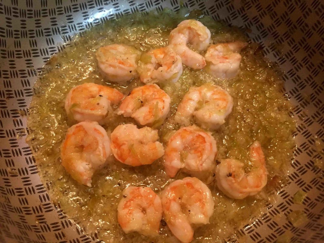 Juntar os camarões e fritar até mudar de cor. Tirar os camarões e reservar.