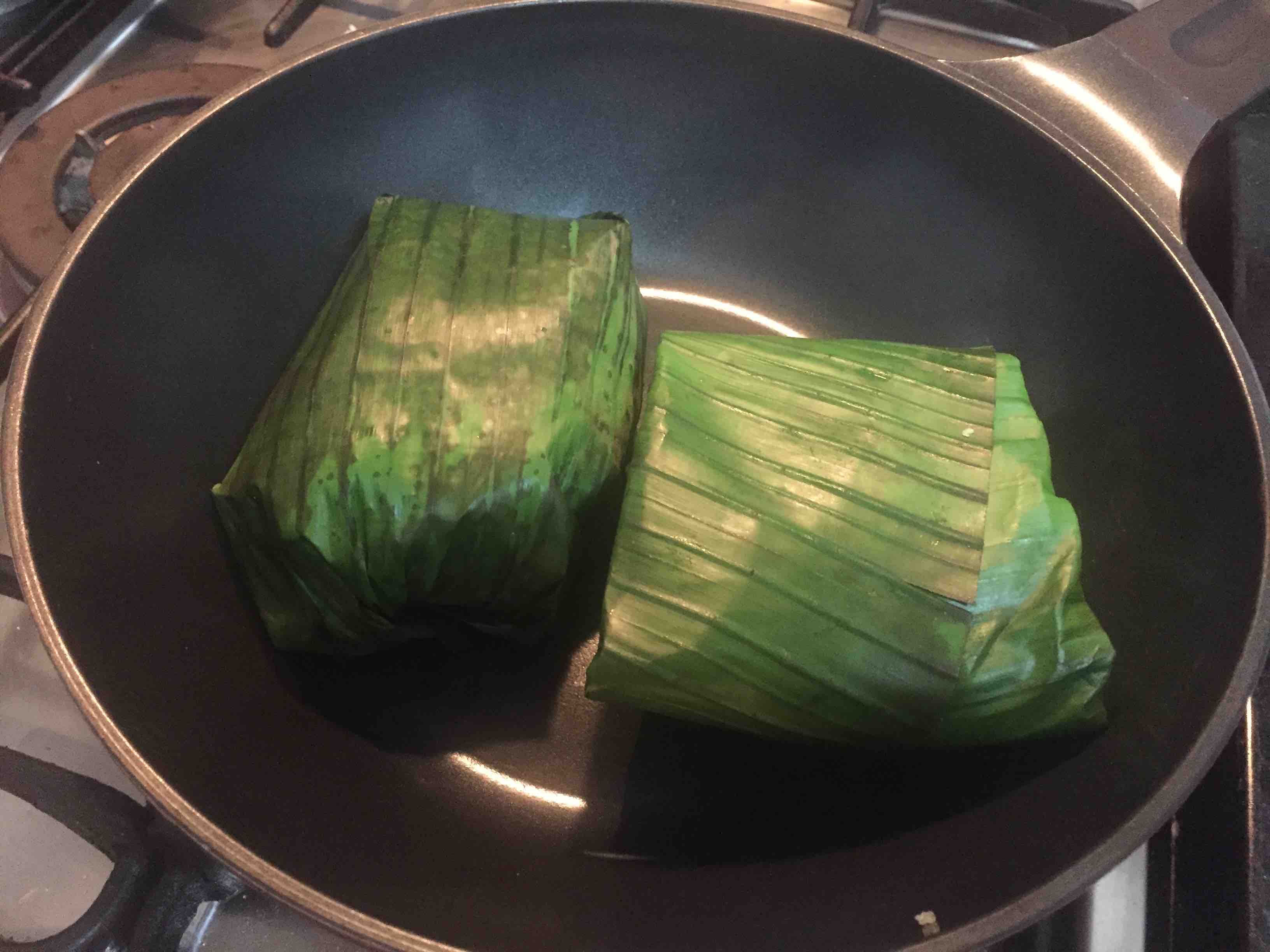 Cortar a folha de bananeira em pedaços de aproximadamente 30 cm de lado e dar uma passada no fogo para amolecer as folhas.