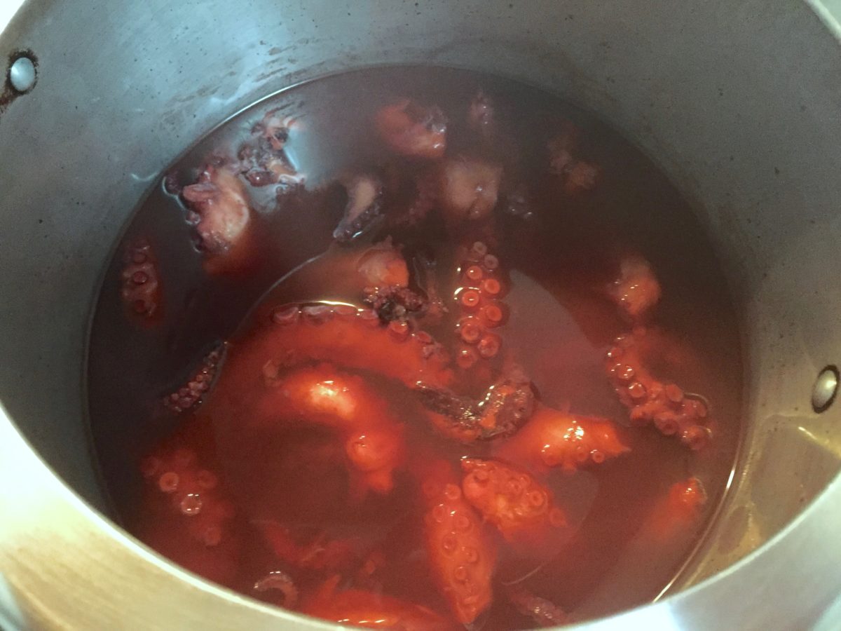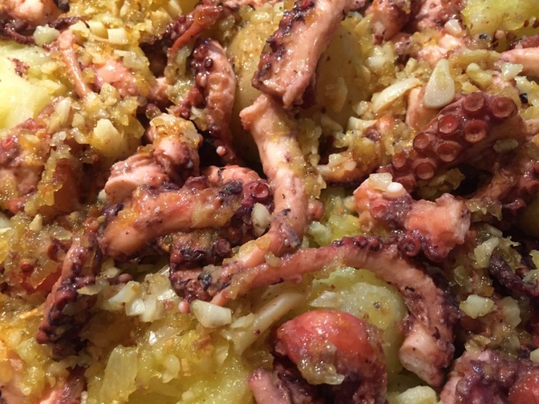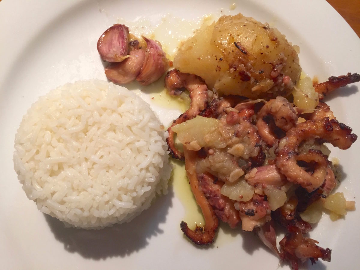 A técnica certa é provavelmente diferente da que faço. Mas como não sabia e estava com muita vontade de comer esse polvo, resolvi arriscar…inventei e deu certo! Fica mesmo bem parecida com a receita portuguesa. (Espero que os portugueses não fiquem muito bravos comigo.)
