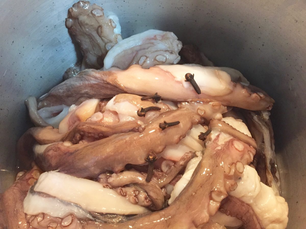 Coloque os tentáculos direto na panela de pressão sem água, acrescente sal e os cravos.
