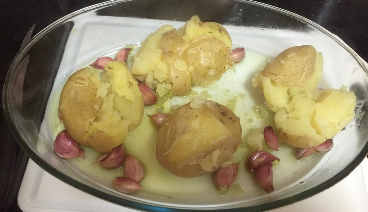 Em um refratário coloque as batatas cozidas e dê um “murro” em cada uma delas para que se abram, mas sem desmancharem muito. Adicione muito azeite, os alhos inteiros e o polvo por cima. Acerte o sal e polvilhe pimenta.